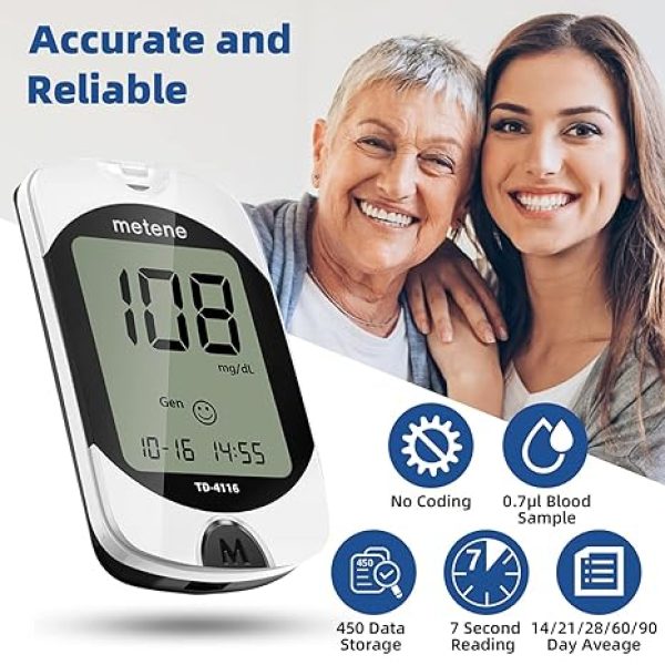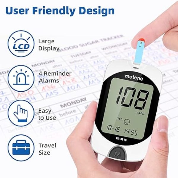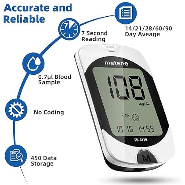 metene TD-4116 diabetes testing kit is equipped with advanced technologies, brings more accurate and reliable results and better experience for your blood sugar control; a control solution is included for checking the glucometer and strips The blood glucose monitor is with code-free design, ready for testing once insert the strip correctly; the quick guide inside the package lists the steps to do a test clearly, easy to follow; any problem about operation, we are here ready to answer and provide glucose monitoring system instructional videos This blood glucose meter kit just needs 0.7 microliter blood sample and 7 seconds to get you blood glucose value; Fast, minimizes wound and less painful 4 modes to record your glucose value according to different time, shows your glucose trend more clearly; 450 blood sugar values storage, continuous 14/21/28/60/90 day average, which brings more convenient Diabetes management for you and your health provider  4 reminder alarms could be set everyday to remind the aged to do a test in time, considerate; the display is larger than most glucose monitors, showing the results more clearly, easier to read for the aged