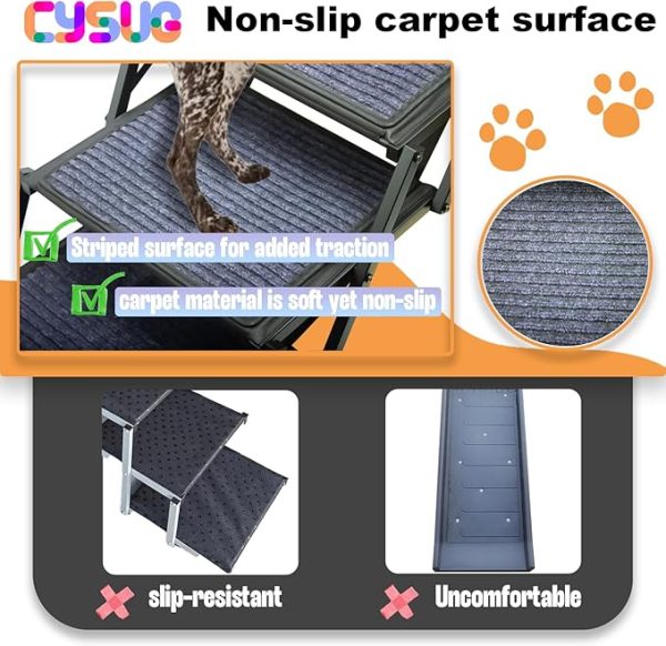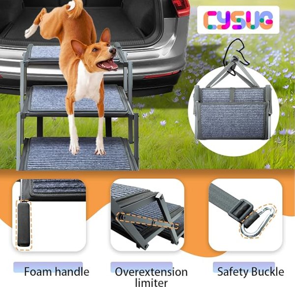 Frequent jumping in and out of cars can strain a dog’s joints. This foldable dog stairs allows safe, independent access, perfect for daily outings or vet visits. No more lifting or worrying about injuries—just set it up and let them climb easily. Our dog stairs features a durable anti-slip rug surface that provides superior traction, even in wet conditions. The soft felt material offers comfort while reducing slipping risks, easing joint pressure, and ensuring stability for your pet as they climb or descend. large pet steps are designed for a wide range of uses, from home to travel. They fit most vehicles, including cars, trucks, and SUVs, making them perfect for both indoor and outdoor use. The dog stairs fold to 17″ x 13″ x 5.5″ for easy storage, and a comfortable handle provides a secure grip for carrying. When extended, the ramp reaches 48″ in length and 23″ in height, offering an ideal slope for pets to access cars, trucks, and SUVs with ease. Featuring a sturdy metal frame with safety locks and a limiter, this pet stairs supports pets up to 250 lbs. The foldable design and reinforced structure provide secure, wobble-free use, making it ideal for large dogs.