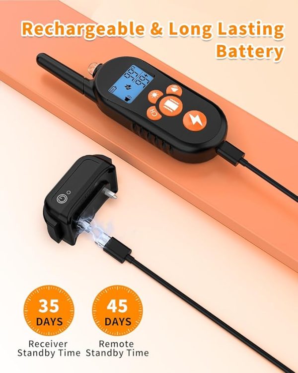 Proper stimulation exercises will help the dog understand your command, correct some inappropriate behaviors. Dog training collar provides 0-99 adjustable levels for vibration and shock modes. We suggest you gradually increase from 1 level to find a proper level for your dogs. (The excessive level may scare your dog.) Dog Shock Collar provides 4 dog training modes (beep, vibration,LED light and shock. Vibration and shock are adjustable from 1-99 levels, it’s the further warnings for adult dogs. Beep is a basic warning. LED light mode is convenient for you to find your dog in the dark environment. Dog training collar with remote range up to 2500ft, makes it easy to train your dog in a park or backyard, no need to follow your dog closely. This training collar receiver is IPX7 waterproof, your dog can swimming directly with it. Only 4-hour for fully charging, and the standby time up to 35 days. (No Charger Included, easily charged by phone adapter, PC, power bank).