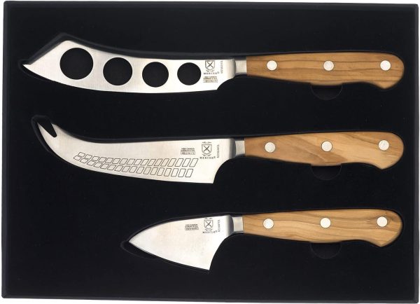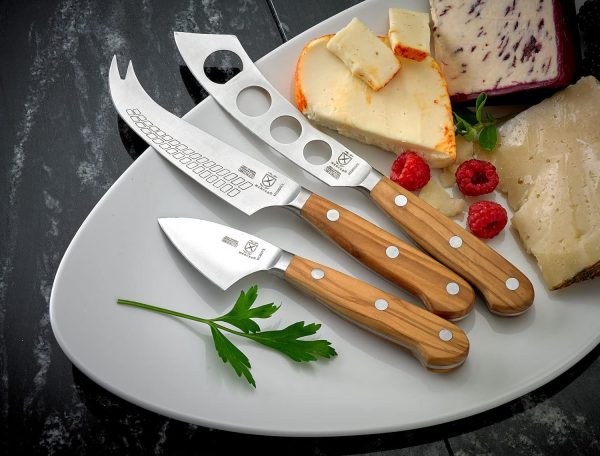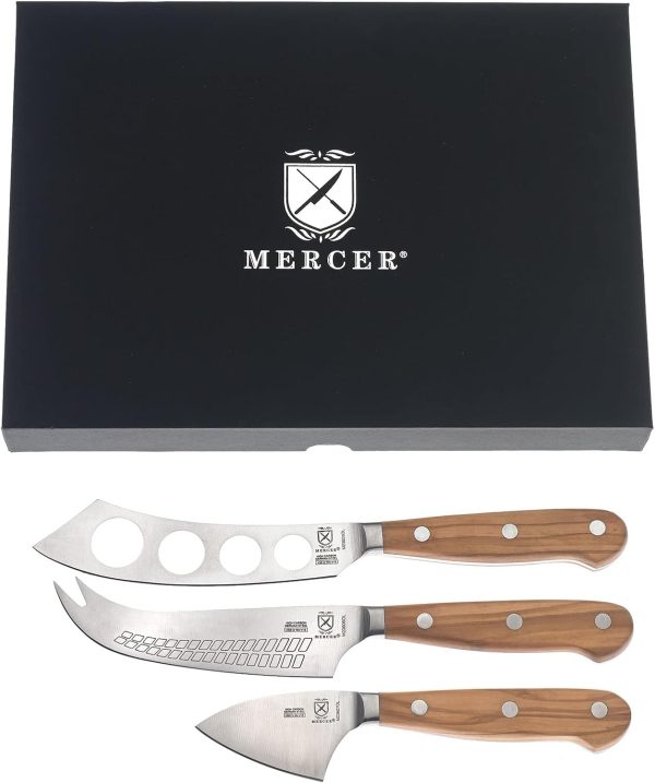 Knife is precision-forged with high-carbon German cutlery steel and taper ground for incredible long-lasting sharpness and easy honing Triple riveted, olive wood handles are comfortable and lightweight, and full tang runs the entire length of the handles for superior balance 5″ Soft Cheese Knife, 4.75″ Hard Cheese Knife, 2.75″ Parmesan Cheese Knife To maximize the performance and longevity of your Mercer knives, carefully wash by hand after each use with warm water and mild soap; rinse and dry completely with a soft towel. Do not place in dishwasher or submerge for long periods of time Our take on a classic with a combination of extraordinary fit, form and function; this Renaissance knife works for professional use or the home cooking enthusiast